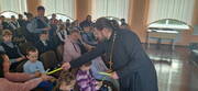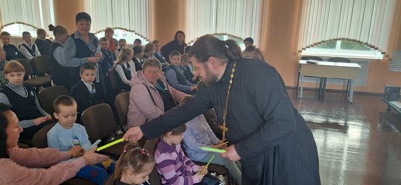Священник напомнил о безопасном поведении на дороге и вручил детям фликеры.