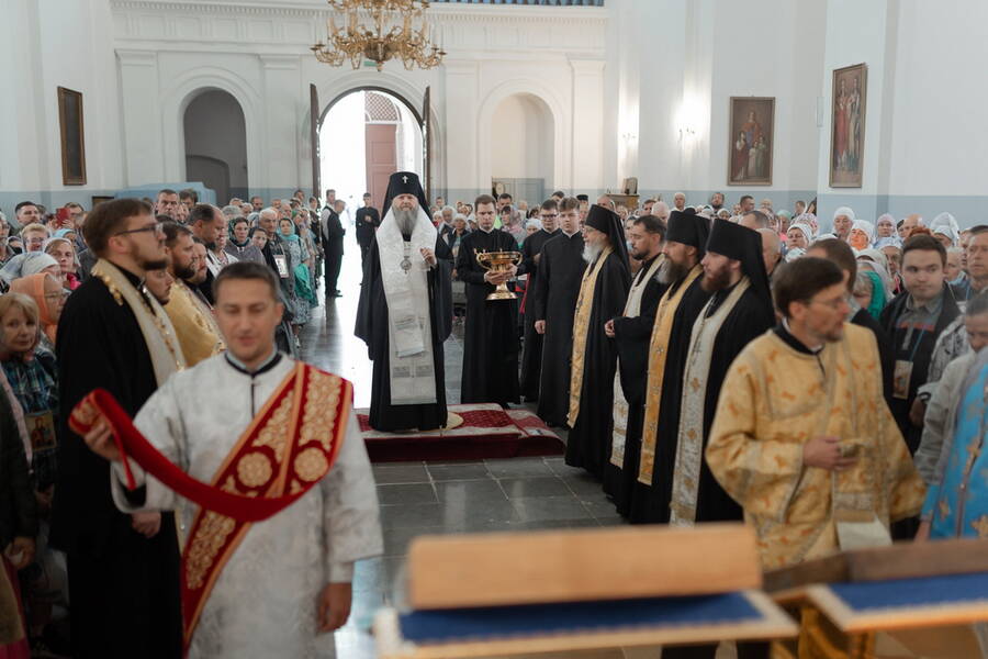 Шествие предварялось молебном в Успенском соборе, который возглавил архиепископ Новогрудский и Слонимский Гурий в сослужении братии монастыря, духовенства Новогрудской епархии и прибывших для участия в крестном ходе священнослужителей из разных уголков нашей страны.