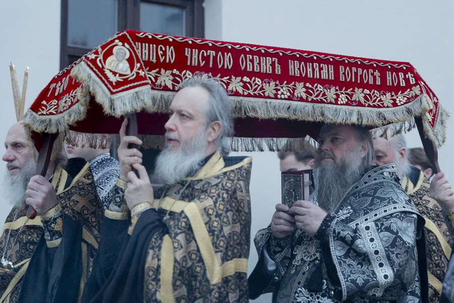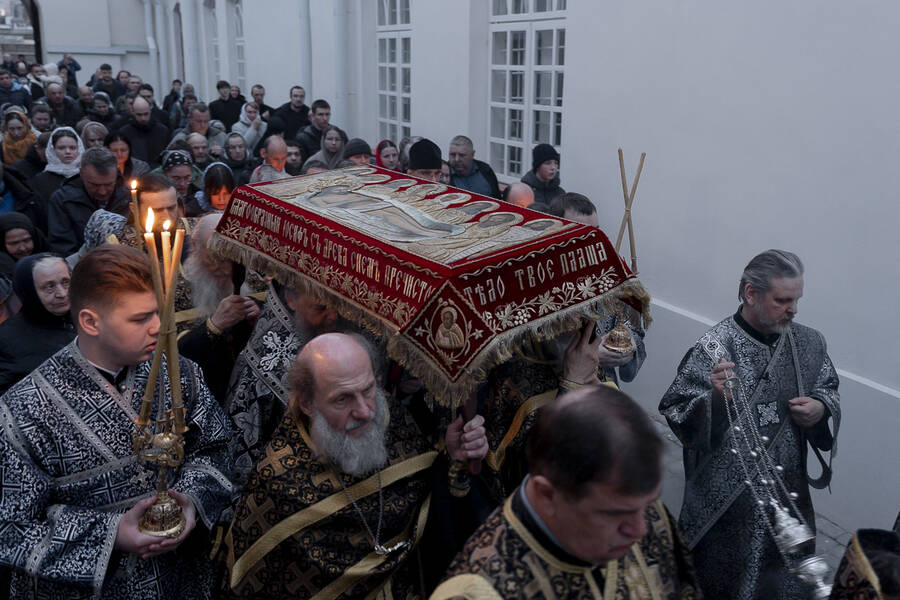 После великого славословия с пением погребального «Святый Боже» был совершен Крестный ход с Плащаницей.