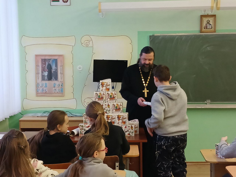 10 января настоятель прихода храма Покрова Пресвятой Богородицы аг. Дворец Дятловского благочиния иерей Сергий Антошков провел беседу на духовные темы с воспитанниками Воскресной школы и детьми из многодетных семей.
