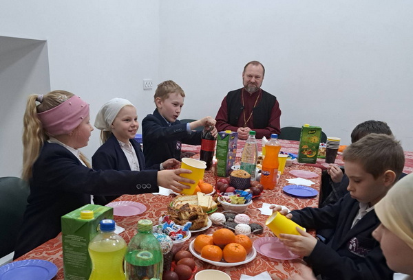 Священник поздравил ребят и педагогов церковно-приходской школы с Пасхой Господней и рассказал им о Крестном подвиге Спасителя и Его Славном Воскресении. Отец-настоятель говорил о дорогой цене, уплаченной Богом за человеческий род, о внимательном отношении к собственной душе, о посещении храма и необходимости принятия участия в Церковных Таинствах, о совершении дел любви и милосердия в святые пасхальные дни. В завершение встречи с детьми прихода иерей Феодор угостил их куличами и сладостями.