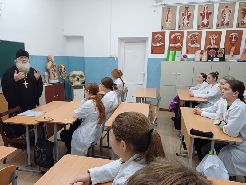 Священник рассказал будущим медицинским работникам о житии и подвиге святителя Луки Крымского (Войно-Ясенецкого), коснулся вопросов почитания родителей и греха сквернословия.