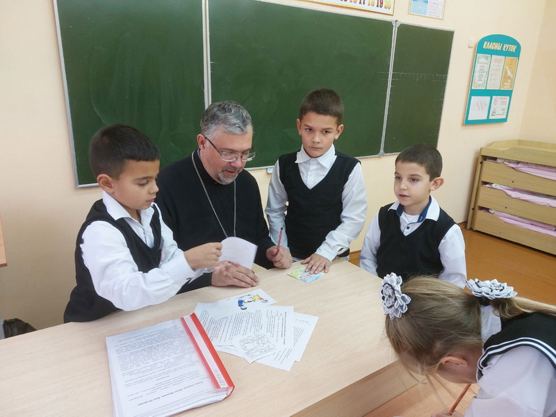 Священник рассказал учащимся о важности исполнения 10 заповедей Закона Божия, а также поговорил о добрых делах и плохих поступках.