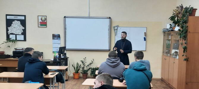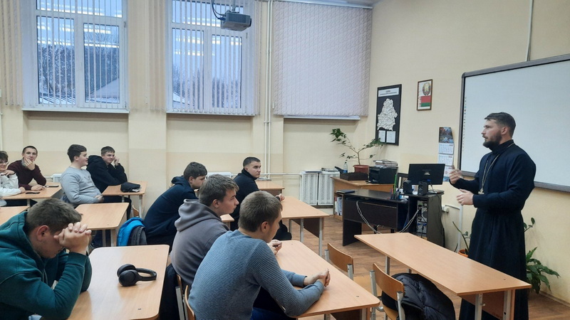 24 ноября клирик храма святых благоверных князей Бориса и Глеба г. Новогрудка иерей Евгений Запольский провел беседу с учащимися 2 курса Новогрудского государственного колледжа на тему: «Брак гражданский и брак церковный».