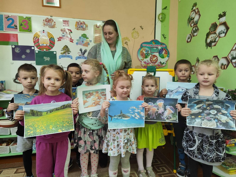 С воспитанниками разновозрастной группы преподаватель Н.В. Цигель говорила на тему: «Красота Божьего Мира». Дети делали тематические поделки, играли в игру «Божий Мир», совершили виртуальное путешествие в лес, слушая в аудиозаписи пение птиц, шум леса, журчание родника, звуки природы.