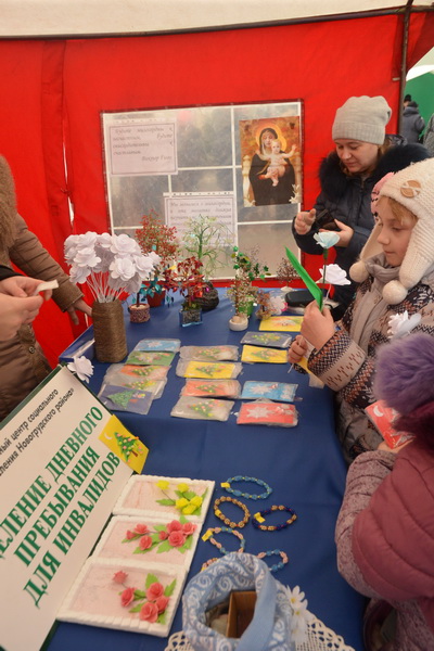 Выбирая понравившуюся поделку, человек знал, что он, покупая ее, жертвует средства от покупки на благотворительные цели. В знак благодарности за добровольное пожертвование каждый участник акции получал белый цветок — символ чистоты, надежды и милосердия.