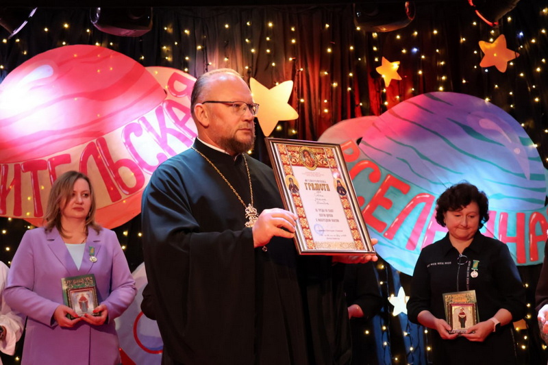 Отец-благочинный вручил учителям архиерейские награды и поблагодарил сотрудников управления образования за реализацию программы между Белорусской Православной Церковью и Республикой Беларусь.
