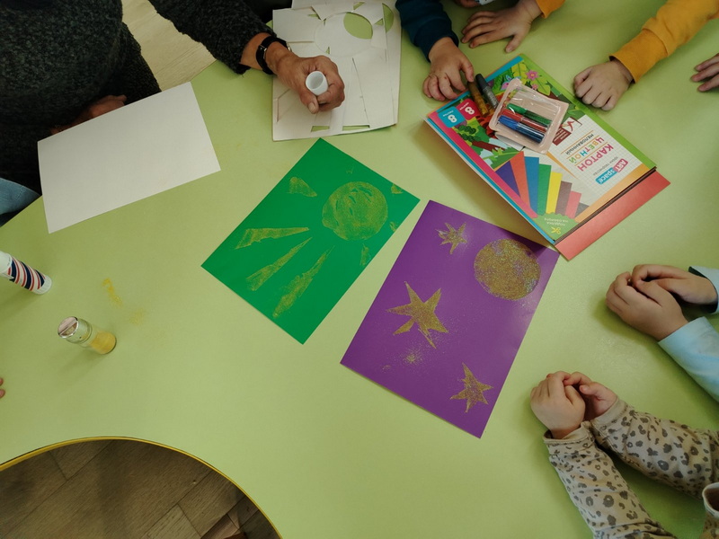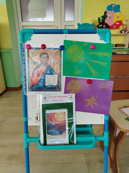 С детьми говорили о первом дне творения, играли в подвижную игру «День и Ночь», делали тематические поделки и читали стихи о сотворении Мира.