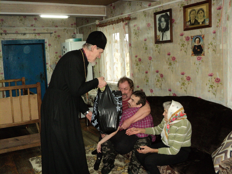 Священник побеседовал с прихожанами на душеполезные темы и вручил им помощь от прихода.
