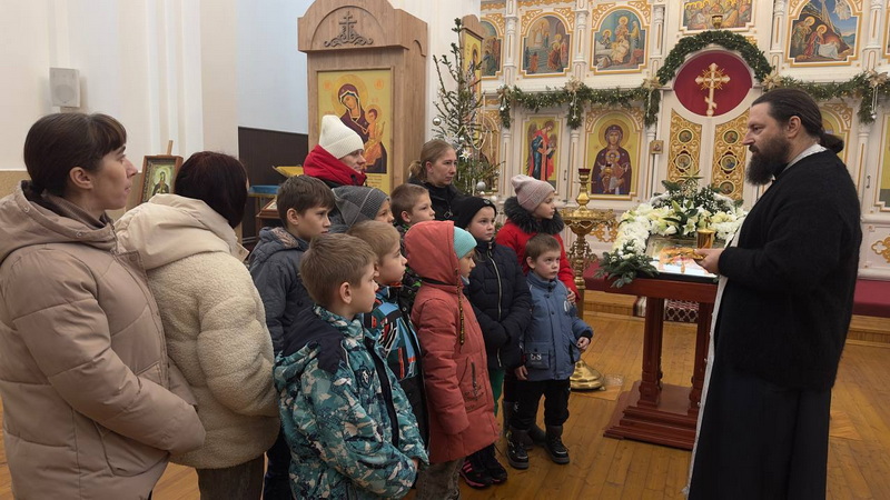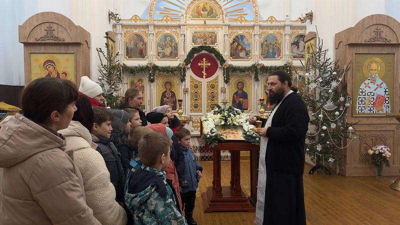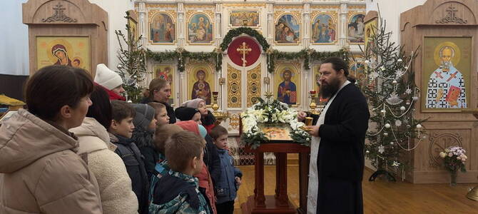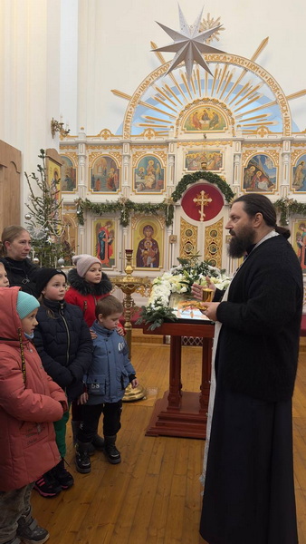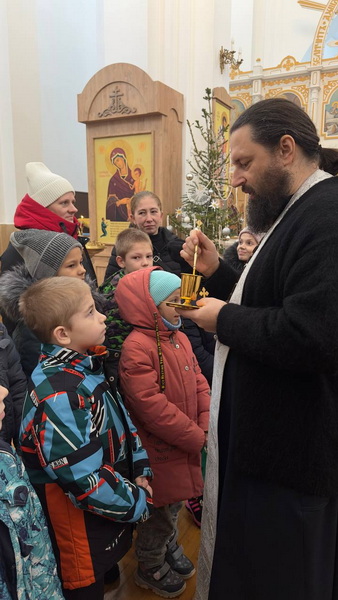 Настоятель храма протоиерей Вадим Кузьмич поздравил семьи, рассказал о сути этого великого события, помазал детей и родителей освященным маслом, пригласил на рождественскую службу.