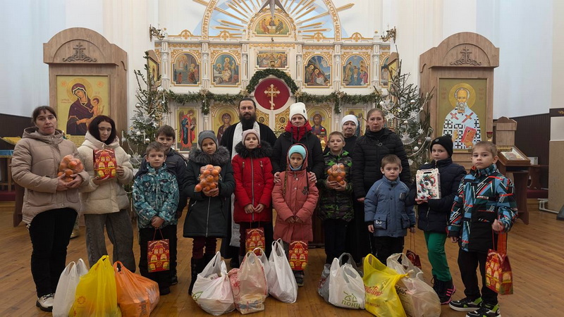Продуктовые наборы, фрукты, игрушки и сладкие подарки были собраны социальной службой Сестричества в честь Святого апостола Иоанна Богослова и вручены семьям Шего, Волковых, Чижик и Глазко. В этих семьях воспитывается от 7 до 11 детей.