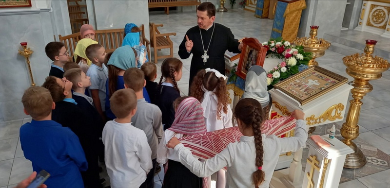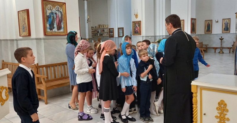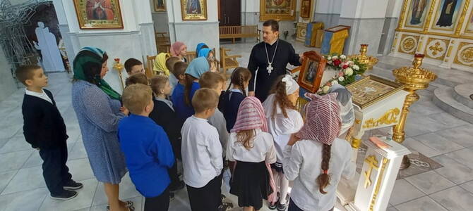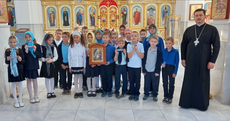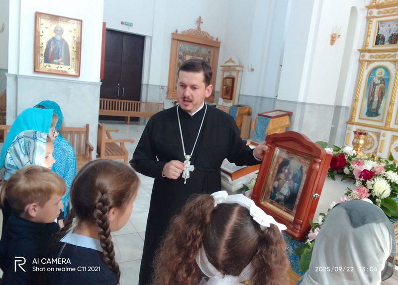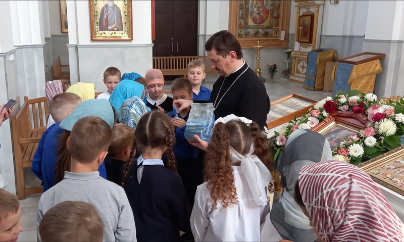 Настоятель храма иерей Иоанн Кисель рассказал ребятам историю праздника Рождества Божией Матери, а также о важности храма в жизни человека. Священник пожелал всем помощи Матери Божией в их земных трудах и вручил сладкие угощения.