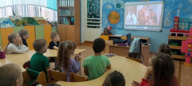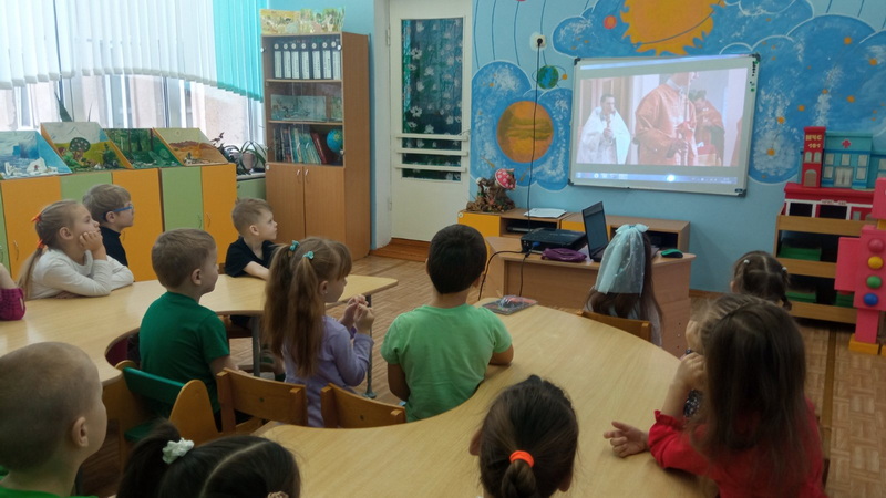 Дети посмотрели фрагмент видеоролика «Крещение ребенка», прослушали и обсудили рассказ «Олины именины», а затем выполнили творческое задание.