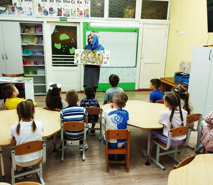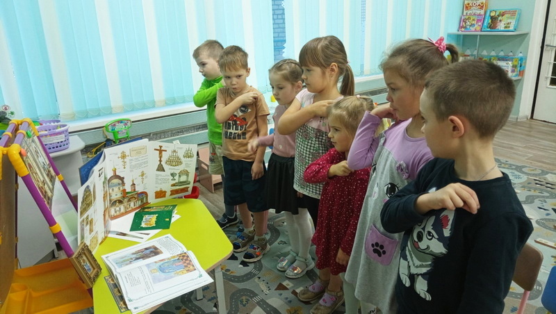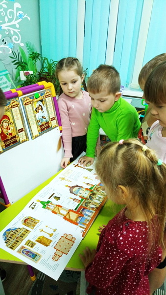 Воспитанники совершили заочное путешествие в храм: познакомились с его убранством, рассмотрели на иллюстрациях иконостас, узнали о колокольном звоне и самой главной службе – Божественной литургии.