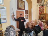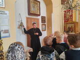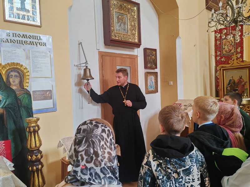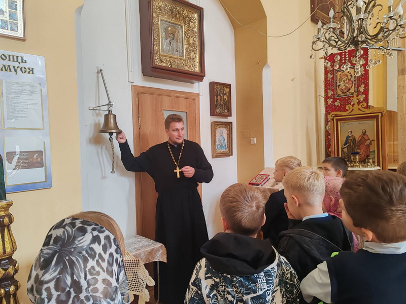 Настоятель храма иерей Игорь Пирог рассказал школьникам историю храма, об его устройстве, колокольном звоне и ответил на интересующие детей вопросы.