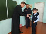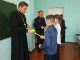 Священник и начальник ГАИ побеседовали со школьниками о безопасном поведении на дороге и вручили им фликеры.