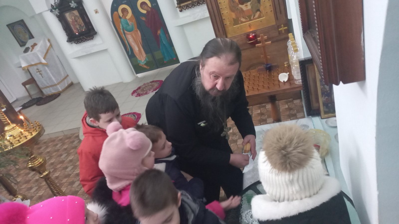 Священник рассказал школьникам о Боге, вере и необходимости учиться молиться. Также он вручил каждому юному христианину сладости.