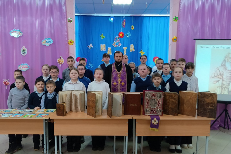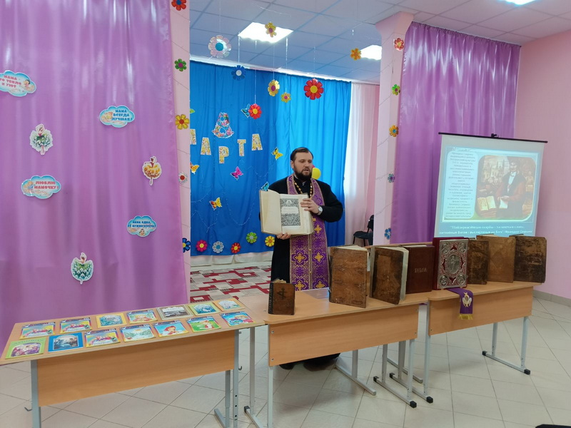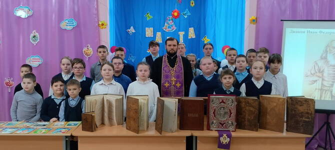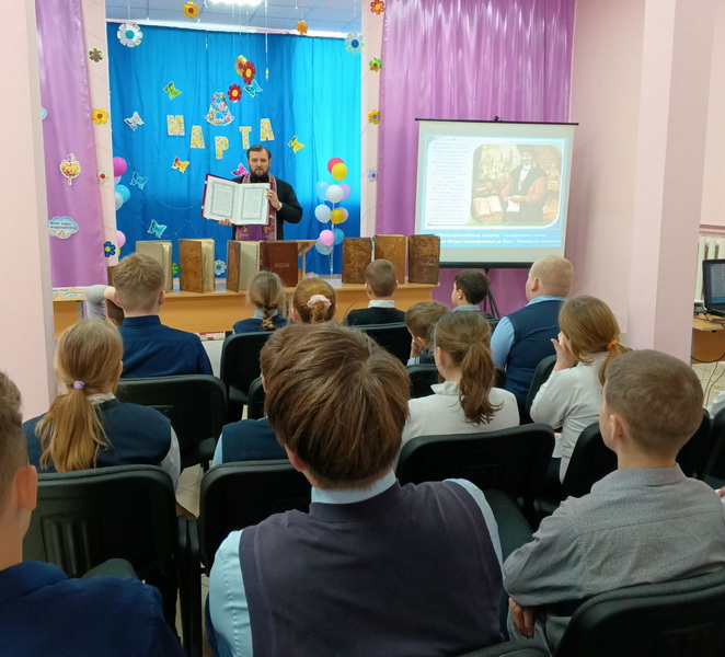 Священник рассказал об истории появления печатной Библии. Учащиеся познакомились со старопечатными богослужебными книгами, хранящимися в храме святителя Николая Чудотворца. Также вниманию школьников была представлена детская православная литература.
