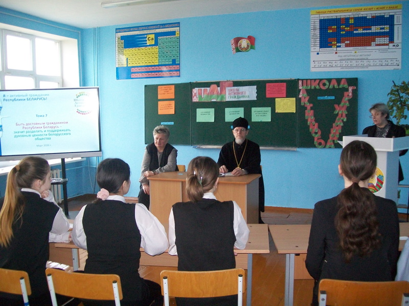 Священник провел беседу с учащимися 8-9 классов, ответил на их вопросы и поделился размышлениями о роли веры в формировании гражданской позиции. Особое внимание он уделил теме Года белорусской женщины. Протоиерей Анатолий рассказал о духовном подвиге белорусских святых женщин, привел примеры их жизни и подчеркнул, как их образы продолжают вдохновлять современное поколение на милосердие, стойкость и служение Богу и ближним.
