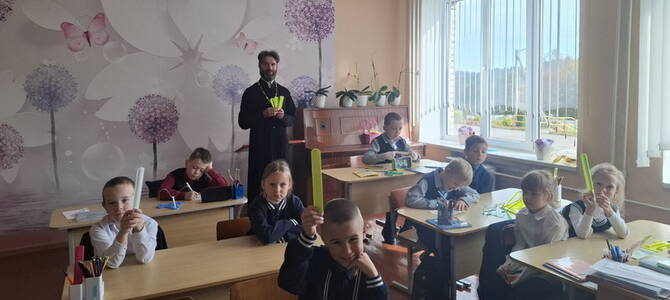 27 ноября настоятель прихода храма Преображения Господня аг. Райца Кореличского благочиния иерей Алексей Шишкир беседовал с учащимися начальных классов Райцевской средней школы им. В.А. Головача.