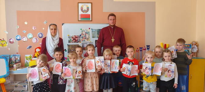 22 апреля настоятель храма святых апостолов Петра и Павла г.п. Кореличи иерей Игорь Пирог вместе с супругой провели беседу в рамках занятия кружка "Добрый Мир" с воспитанниками кореличского детского сада №1.