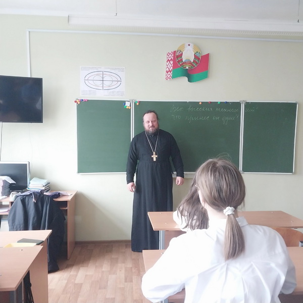 6 февраля настоятель прихода храма преподобномученика Афанасия Брестского г. Слонима протоиерей Владимир Бобчик побывал в СШ №4 им. П.И. Батова, где провел духовно-нравственную беседу с учениками 8 "А" класса на тему: «Век высоких технологий. Что принес он душе?».