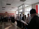 Также священник поздравил школьников с Днем православной молодежи, зачитал Патриаршее послание, адресованное православной молодежи, и вручил всем присутствующим сретенские свечи.