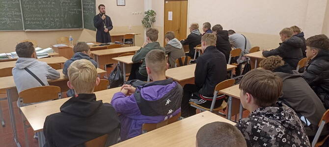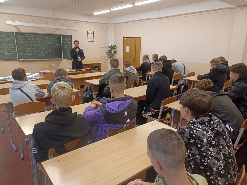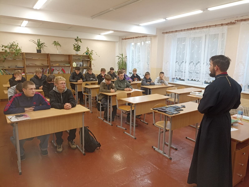 7 октября настоятель храма святых апостолов Петра и Павла аг. Валевка Новогрудского благочиния иерей Евгений Запольский провел беседу с учащимися 1 курса Новогрудского государственного колледжа на тему: «10 Заповедей».