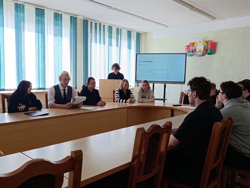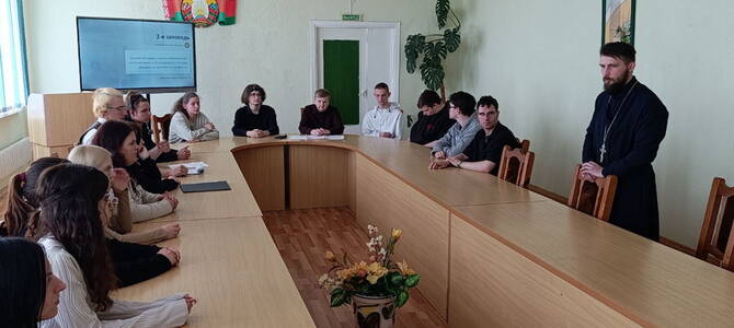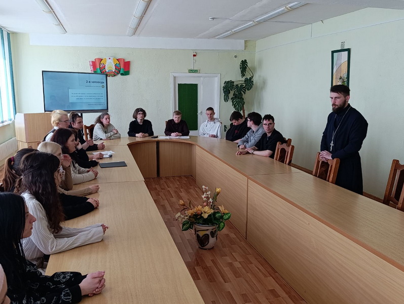25 апреля настоятель храма святых апостолов Петра и Павла аг. Валевка иерей Евгений Запольский принял участие в открытом уроке на тему "10 Заповедей" в Новогрудском государственном колледже.