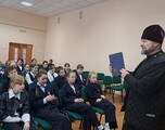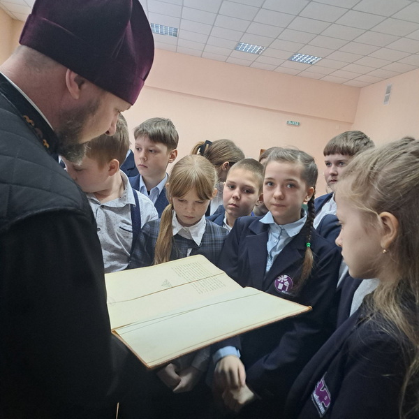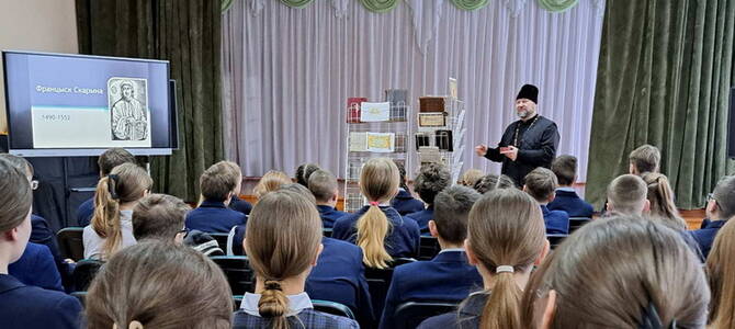 Для учащихся 5-7 классов священнослужитель подготовил выставку православной литературы, приуроченную к предстоящему Дню православной книги. Иерей Феодор рассказал о трудах первых книгопечатников, о значимых событиях нашей Родины, связанных с историей православной книги. Он акцентировал внимание на значении православной культуры и на том, какой след в душе человека может оставить печатное духовное слово, какой неисчерпаемый источник мудрости и благодати представляет собой православная книга.