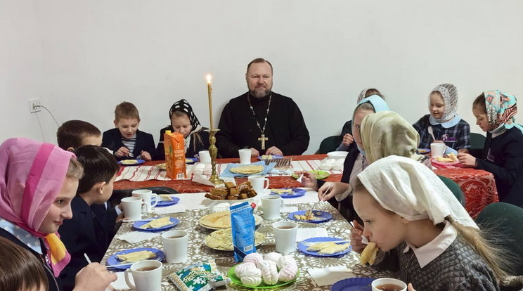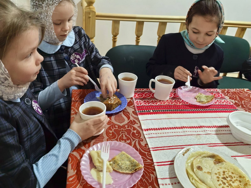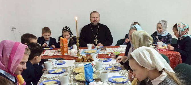 Священник рассказал детям о значении сырной седмицы и об отличии ее от Масленицы. Он отметил, что это период не столько праздничных гуляний с блинами, сколько время осмысленной подготовки к подвигу веры — Великому посту.