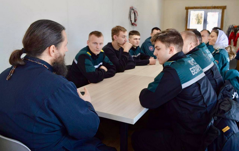 После молитвы прошла беседа с настоятелем храма протоиереем Вадимом Кузьмичом о мотивации в профессии спасателя. Священник подчеркнул, что внешние стимулы и материальная выгода не могут быть прочной основой для служения, требующего готовности рисковать собой ради других. Истинную готовность может дать только любовь, понимаемая как деятельная сила: долг, ответственность, терпение, верность и способность к самопожертвованию.