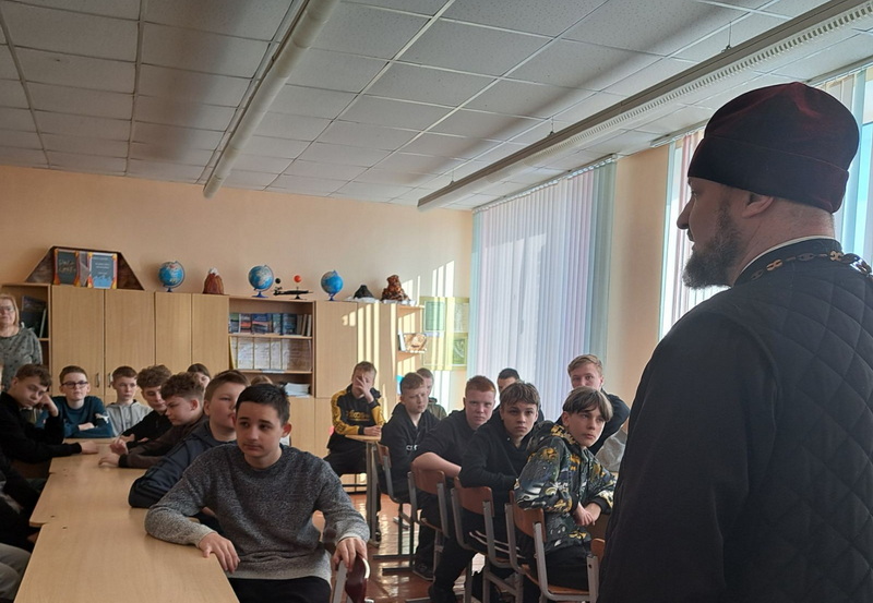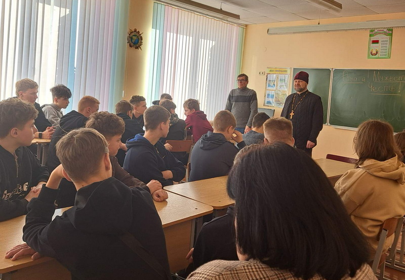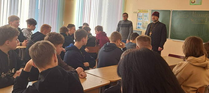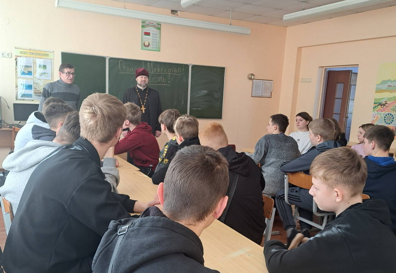 28 февраля настоятель Свято‑Троицкого храма г.п. Мир Кореличского благочиния иерей Феодор Лукашевич побывал в Мирской средней школе им. А.И. Сташевской, где провел беседу с учащимися 7–8 классов на тему «Отвага. Мужество. Честь».