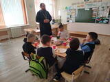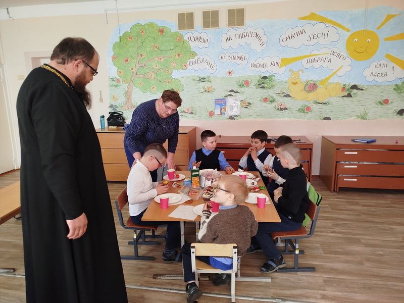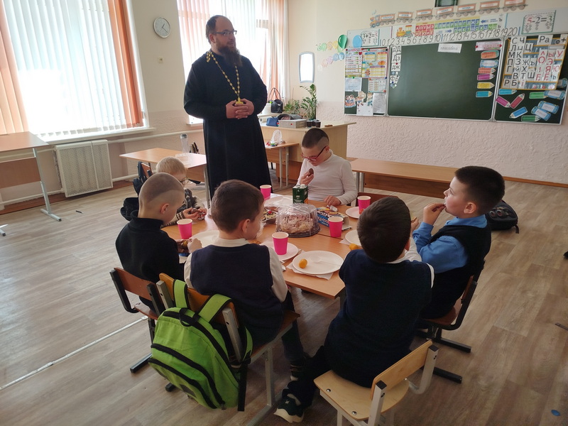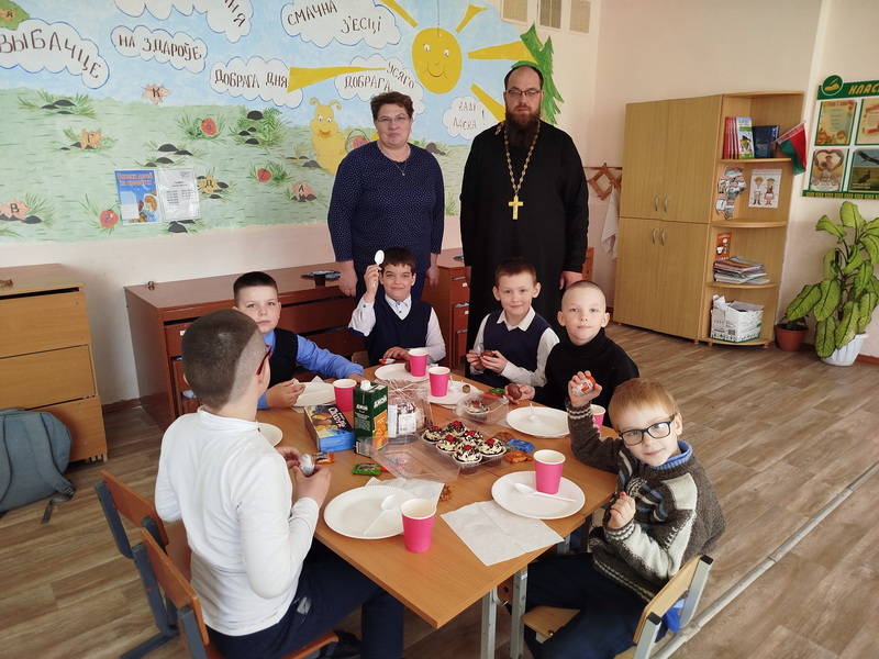 14 апреля настоятель храма святого великомученика Димитрия Солунского аг. Щорсы Новогрудского благочиния иерей Димитрий Почебут провел беседу с учащимися младшей возрастной группы Щорсовской средней школы на тему: "Пасха Христова".