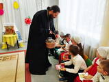 Священник поздравил всех с праздником Пасхи, рассказал о том, как удерживать радость святого праздника в сердце, и вручил малышам детские молитвословы и пасхальные пряники.