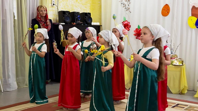 Руководитель кружка «Добрый Мир» А.Н. Золотова, воспитатели и музыкальный работник подготовили с воспитанниками праздничную программу. Ребята читали стихи, пели, танцевали, играли в пасхальные игры, отвечали на вопросы викторины.