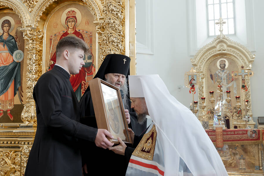 За богослужением права служения Божественной литургии с отверстыми Царскими вратами по «Иже Херувимы…» митрополит Вениамин удостоил ректора Минской духовной семинарии протоиерея Виктора Василевича. Также права ношения наперсного креста золотого цвета был удостоен насельник Жировичского монастыря иеромонах Питирим (Дудкин).
