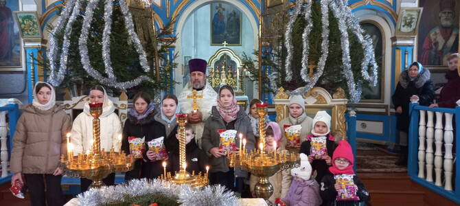7 января настоятель храма Успения Пресвятой Богородицы г.п. Козловщина Дятловского благочиния протоиерей Георгий Ярмолич поздравил детей из многодетных семей, детей-инвалидов и учащихся Воскресной школы со светлым праздником Рождества Христова, пожелал им помощи Божией в учебе и трудах на благо Церкви, а также вручил рождественские подарки.