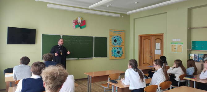 24 апреля настоятель прихода храма святого преподобномученика Афанасия Брестского г. Слонима протоиерей Владимир Бобчик провел духовно-нравственную беседу с учащимися 9 класса средней школы №4 им. П.И. Батова на тему:"Помни корни свои. Зачем нам нужна память о предках? Радоница".