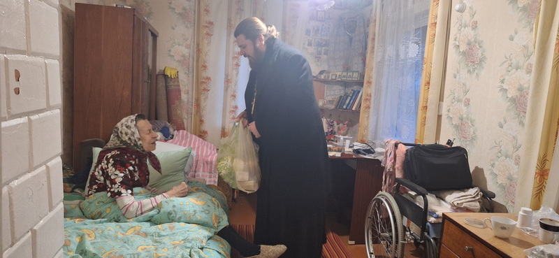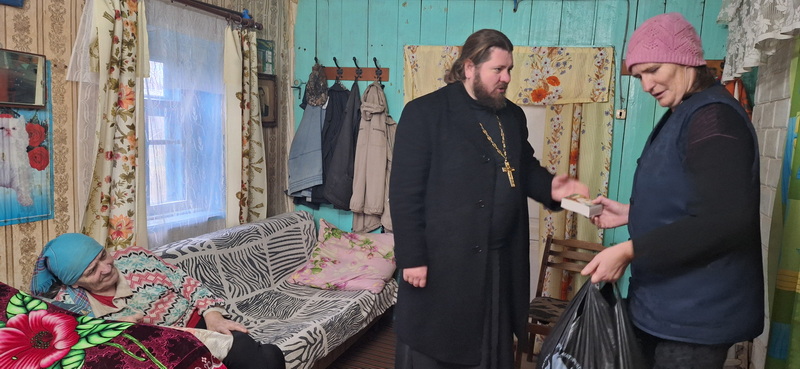 Священник побеседовал с прихожанами о приближающемся празднике Рождества Христова и передал им продуктовые наборы.