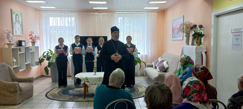 14 октября, в праздник Покрова Пресвятой Богородицы, настоятель храма Успения Пресвятой Богородицы г.п. Козловщина Дятловского благочиния протоиерей Георгий Ярмолич, воспитанники и преподаватель Воскресной школы Т.А. Буяк навестили пациентов отделения сестринского ухода для пожилых людей при Козловщинской больнице.