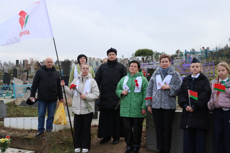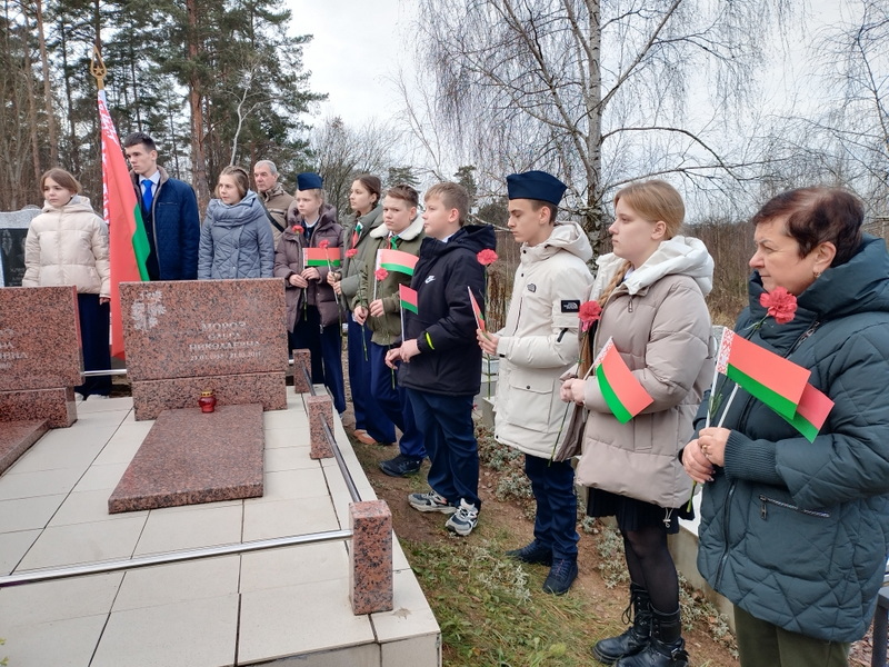 В мероприятии приняли участие внучка ветерана Ю. Кондратьева, начальник управления образования И.В. Осташевич, руководство и учащиеся средней школы № 1 г.п. Кореличи.