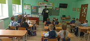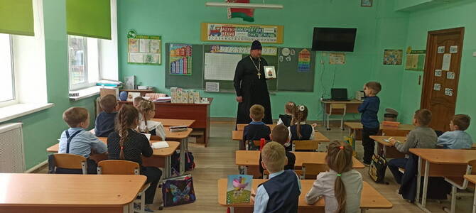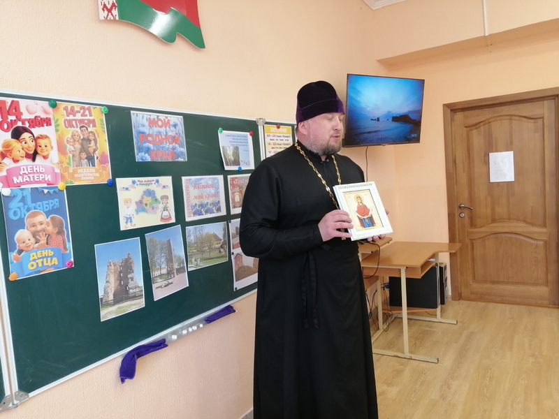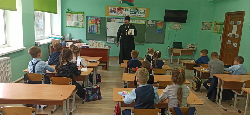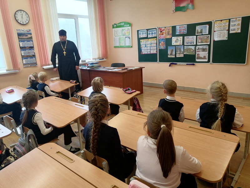 С учащимися 1 «Б»,2 «А», 3 «Б» и 7 «А» классов беседовал клирик Свято-Никольского кафедрального собора иерей Николай Лащевский.