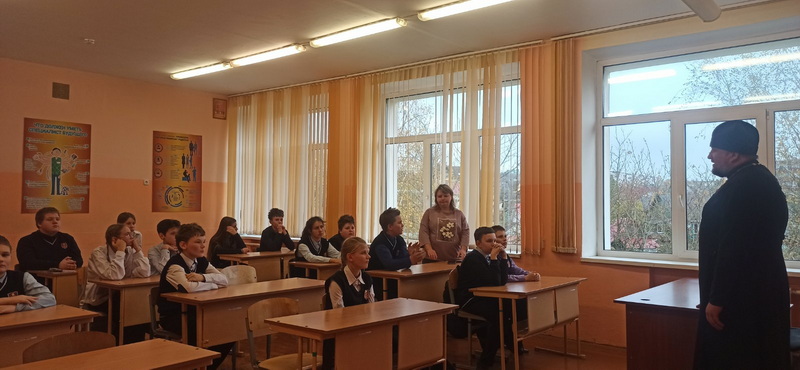 Священник рассказал школьникам о духовных и социальных последствиях сквернословия, а также историю праздника Покрова Пресвятой Богородицы. Особое внимание в беседе он уделил почитанию родителей как основе крепкой и счастливой семьи.