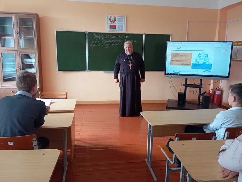 18 сентября настоятель прихода храма святого архангела Михаила аг. Цирин Кореличского благочиния протоиерей Олег Сушко принял участие в информационном уроке для учеников 8-9 классов Циринской базовой школы. Тема урока – «Психологическое благополучие подростка».
