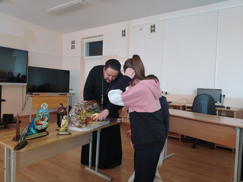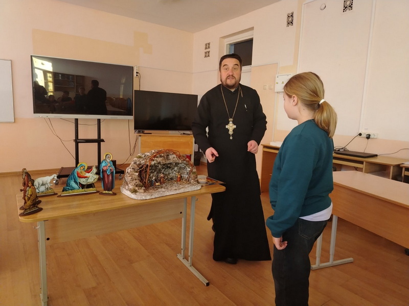 Священник побеседовал с учащимися о празднике Рождества Христова, рассказал о евангельской истории и традициях, связанных с праздником. Также дети приняли активное участие в предложенных играх и викторинах, посвященных приближающемуся празднику, и в качестве призов получили сладкие подарки от протоиерея Геннадия.