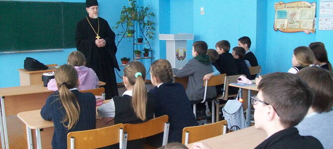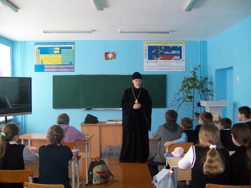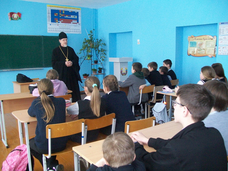 11 февраля настоятель храма Святой Живоначальной Троицы аг. Деревная Слонимского благочиния протоиерей Анатолий Ежевский провел беседу с учащимися 5–7 классов Деревновской базовой школы на тему: «Совесть — наш внутренний судья».
