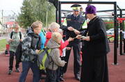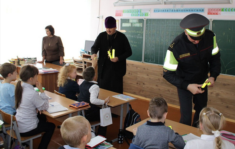 Все учащиеся получили от священника и сотрудника Госавтоинспекции фликеры.