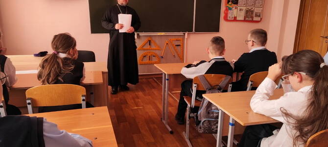 3 февраля настоятель прихода храма святого преподобномученика Афанасия Брестского г. Слонима протоиерей Владимир Бобчик побывал в средней школе № 4 им. П.И. Батова, где провел для учащихся 6 «А» и 6 «Б» классов духовно-нравственную беседу на тему «Стыд и совесть».
