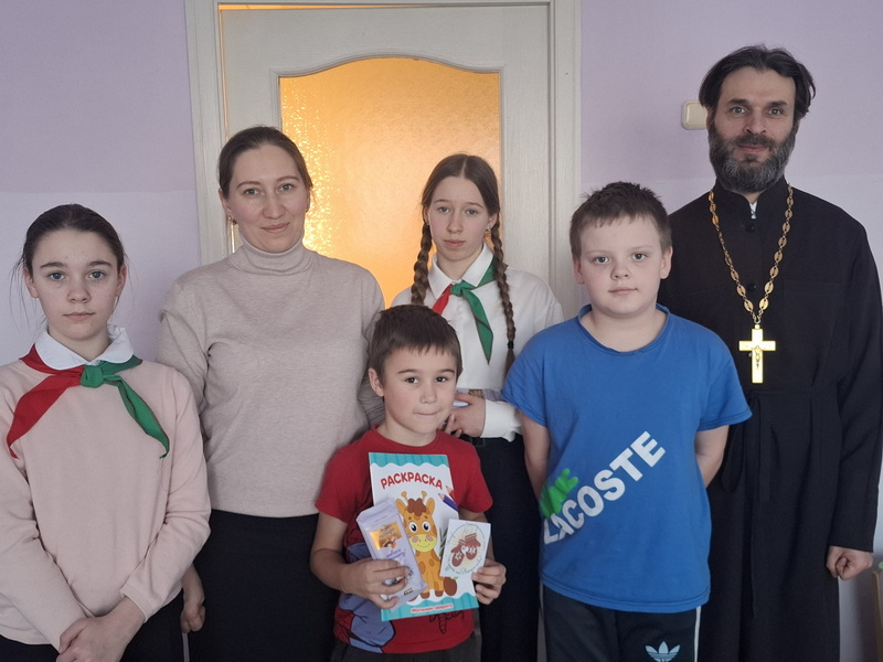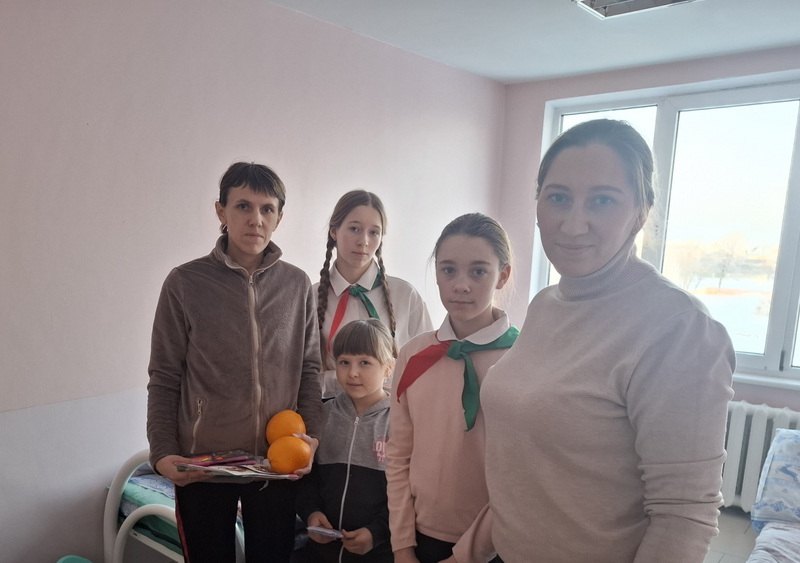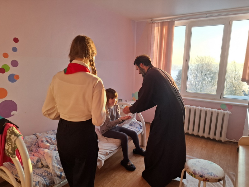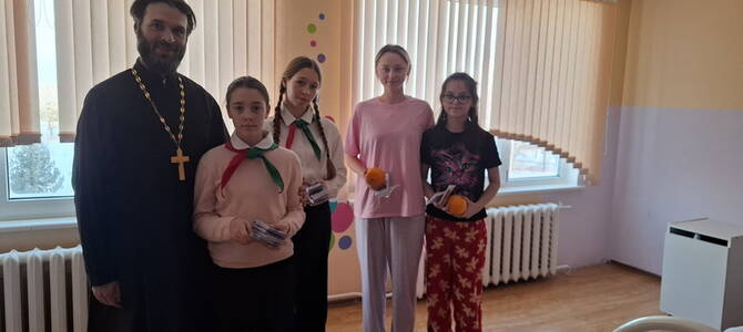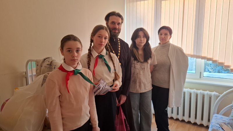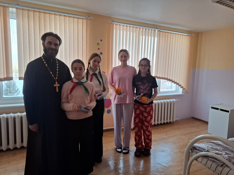 Священник и школьники поздравили детей с Рождеством Хрисовым, пожелали скорейшего выздоровления, а также вручили фрукты и подарки.